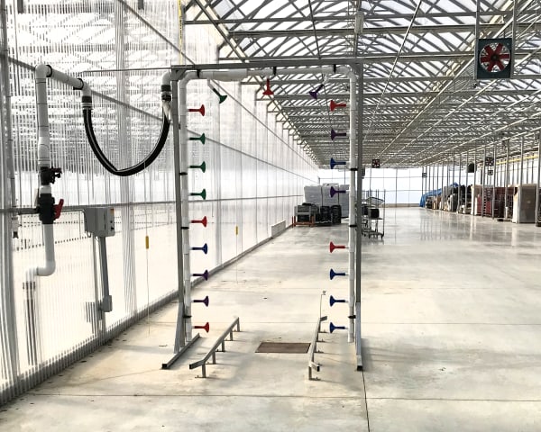 The Cart Watering Tunnel tunnel allows you to roll a train of carts through the watering tunnel to hydrate all the plants before they go out on the trucks so that they arrive at retail ready to sell.